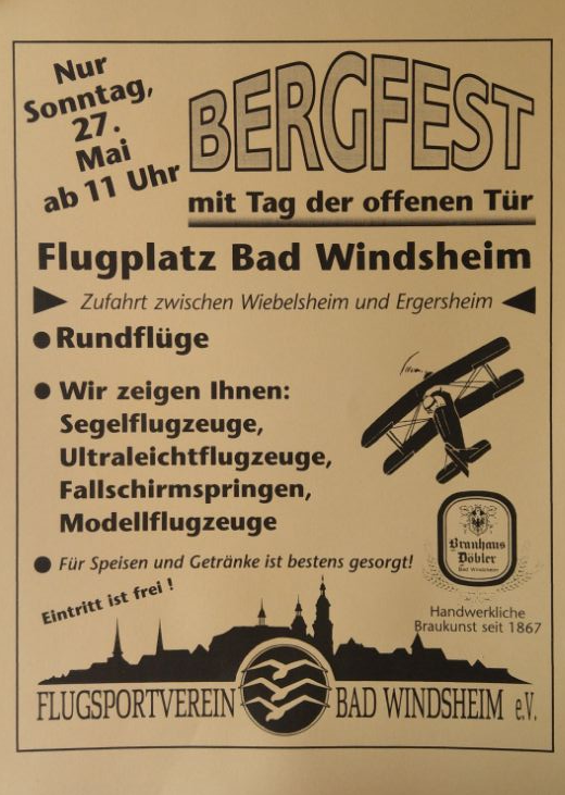 Wir laden herzlich zu unserem alljährlichen Bergfest ein. Am Sonntag dem 27.Mai ab 11 Uhr gibt es am Flugplatz Bad Windsheim wieder alles zur Fliegerei zu bestaunen. So präsentieren zum […]